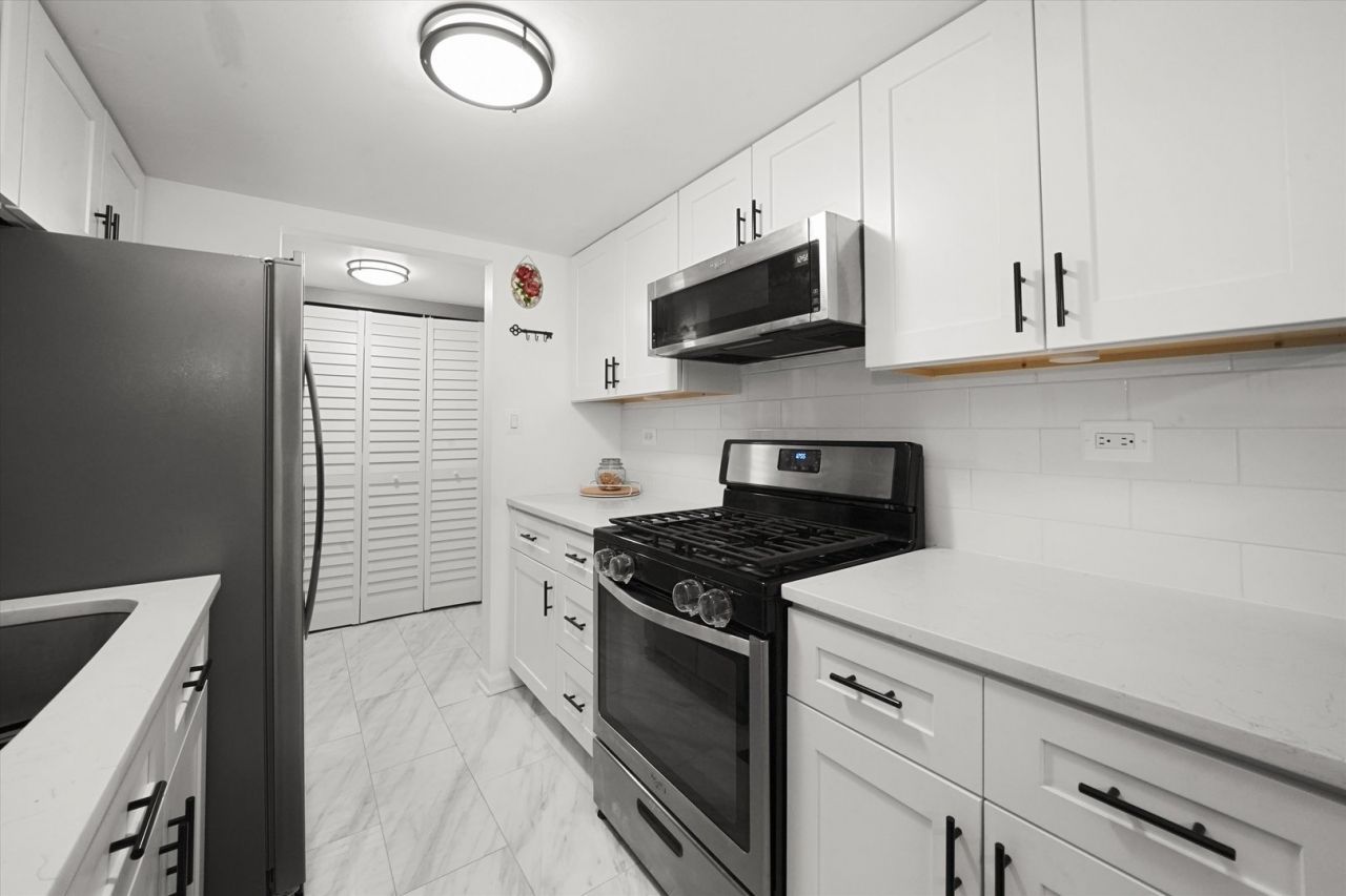 GORGEOUS and Move-In Ready! This beautifully updated 2-bedroom, 1.5-bath condo in desirable Lake in the Woods offers modern style and comfort throughout. The kitchen features white shaker cabinets, quartz countertops, and plenty of storage. Both bathrooms have been tastefully remodeled with new vanities and countertops. Enjoy newer flooring, a brand-new sliding door, and an extra-large balcony with serene open views. Assessment includes heat, water, and scavenger services. Additional perks include assigned parking, coin laundry in the building and large storage space. Conveniently located near shopping, restaurants, and easy expressway access!